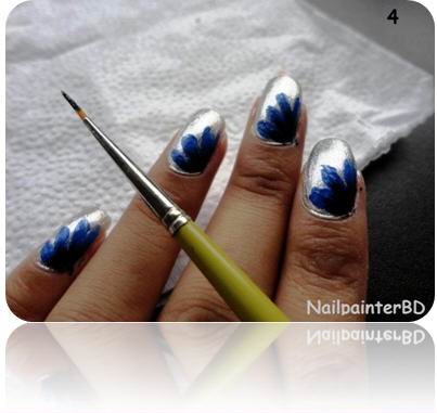 ফ্ল্যাট ব্রাশের ২ সাইডে নীল আর হালকা নীল রঙের এক্রেলিক রঙ লাগিয়ে নখের কোণায় ৩ টা ফুলের পাপড়ির ডিজাইন করতে হবে।