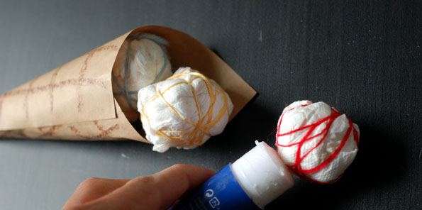 এখন সাদা রং এর টয়লেট পেপারকে মুচড়ে গোল বল তৈরি করুন এবং নানা রং এর রেশমী সুতা দিয়ে একে মুড়িয়ে নিন। এভাবে ৩/৪ টি ছোট ছোট বল তৈরি করুন।